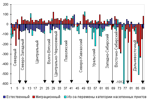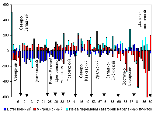 В ряде случаев решающими были административно-территориальные преобразования (наиболее яркие примеры - Усть-Ордынский Бурятский и Коми-Пермяцкий автономные округа, республики Карелия и Калмыкия, Оренбургская область), в других - процессы межрегиональной и межстрановой миграции (Чукотский, Таймырский и Ненецкий автономные округа, Якутия). Реже интенсивная убыль городского населения была обусловлена и тем, и другим фактором вместе (в республиках Кабардино-Балкарии, Карачаево-Черкесии, Бурятии, Коряксюм, Эвенкийском и Ямало-Ненецком автономных округах, Тюменской, Камчатской и Магаданской областях). В некоторых регионах Севера и Дальнего Востока снижение численности горожан было обусловлено всеми тремя компонентами, включая естественную убыль населения (в Мурманской, Архангельской, Сахалинской, Амурской, Читинской и Иркутской областях, Хабаровском и Приморском краях, Республике Коми). Городское население Европейского Центра росло за счет миграционного притока, который, однако, в большинстве случаев не перекрывал естественную убыль.
