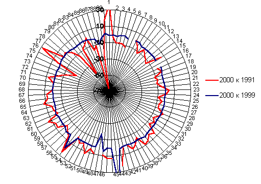 В отличие от предшествующих межпереписных периодов сельское население выросло абсолютно и относительно как по России в целом, так и в ее отдельных крупных районах, прежде всего на Северном Кавказе и в Западной Сибири. Особенно значительно за 1989-1999 гг. увеличилось число сельских жителей в Республике Карелии (на 36%), Усть-Ордынском Бурятском автономном округе (почти на 30%), Республике Дагестан и Оренбургской (на 25-26%), а также в Калининградской (20%) областях.