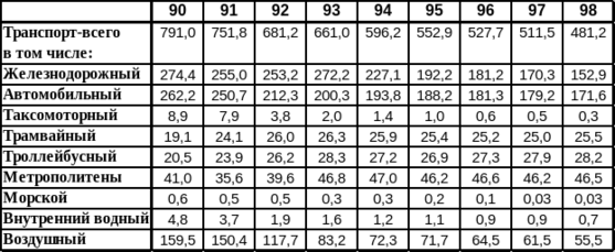 В 1998 году они составили 2337,6 миллионов тонн грузов по видам транспорта общего пользования, что на 233,2 миллиона тонн меньше по сравнению с прошлым годом. За период с 1990-го по 1998-ой год данный показатель снизился почти в 3 раза или на 4520,9 миллионов тонн (6858,5 и 2337,6 миллионов тонн соответственно).
