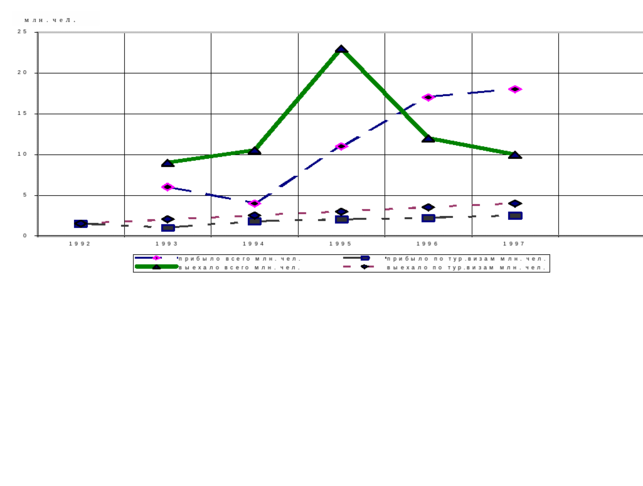 Дефицит платежного баланса по статье "Туризм" составил в 1994 году около 5 млрд. долларов. Материальная база туризма более чем на 80% нуждается в реконструкции. Ощущается острый дефицит квалифицированных специалистов по туризму. Такое положение объясняется неустойчивой экономической ситуацией в стране, снижением уровня жизни и резким усилением дифференциации доходов населения, а также криминогенной ситуацией в ряде регионов, не способствующей увеличению туристов в Россию. В 1997 году из России с туристскими целями выехало в 1,7 раза больше туристов, чем прибыло. (График 1.)