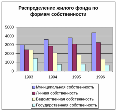 Распределение жилого фонда по формам собственности, изображённое на графике, как раз и послужило причиной того, что я выбрал демонополизацию фонда основным направлением реформы ЖКХ. На диаграмме видно, что количество личной собственности на квартиры значительно выросло, но одновременно с этим выросло и количество муниципального жилья. В итоге получилось, что в относительном выражении эти величины изменились не слишком существенно, и личная собственность составляет около 34%, муниципальная – около 45%. Итак, прослеживается тенденция к увеличению объёма и доли муниципальной и личной собственности на жильё, и снижению государственной и ведомственной.
