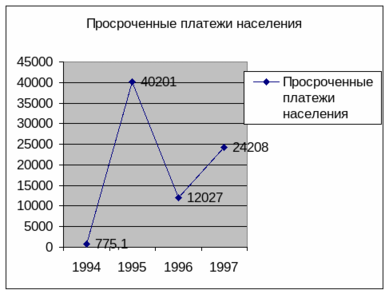 Не смотря на то, что среднемесячная зарплата превышает прожиточный минимум, можно видеть крупные суммы просроченных платежей населения по оплате жилищно-коммунальных услуг. Это говорит о том, что показатель прожиточного минимум слишком относителен и не даёт полной картины уровня жизни населения. Просроченные платежи составляют довольно крупные суммы, но максимальная сумма образовалась в 1995 году. С тех пор этот показатель существенно упал, но всё ещё продолжает достаточно быстро расти. Такая тенденция будет иметь негативное влияние на проведение реформы жилищно-коммунального хозяйства.