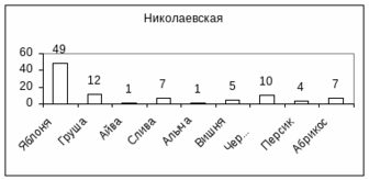 | Летние: Мелба Папировка Украинское Шафран летний Яндыковское Старк Эрлиест Осенние: Слава победителям Мекинтош Ренет Лендсберга Уэлси | + + + + + + + | + + + | + + + + + + | + + + + + + | + + + + + + | |||||