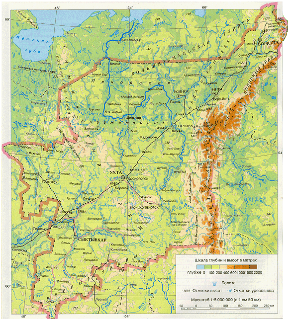 Территория. Площадь республики - 416,8 тыс.кв.км (2,4% Российской Федерации). Территория имеет наибольшую протяженность с юго-запада на северо-восток - 1275 км, с севера на юг - 785 км, с запада на восток - 695 км. Общая длина границ - 4415 км. На западе, северо-западе и севере республика граничит с Архангельской областью (2170 км) с входящим в нее Ненецким автономным округом (870 км), на востоке - с Ямало-Ненецким (480 км) и Ханты - Мансийским (570 км) автономными округами Тюменской области, на юго-востоке - со Свердловской (35 км), а на юге - с Пермской областью - (645 км), в том числе с Коми-Пермяцким автономным округом (335 км), на юго-западе - с Кировской областью (515 км). В республике 10 городов. Среди них республиканского значения: Сыктывкар, Воркута, Вуктыл, Инта, Печора, Сосногорск, Усинск, Ухта (сосредоточено 58% населения), районного - Емва, Микунь.