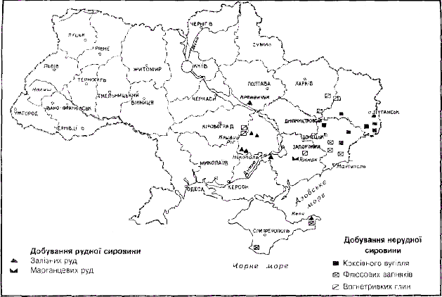 Наочно побачити розміщення деяких видів сировини для чорної металургії можна з наступної карти: