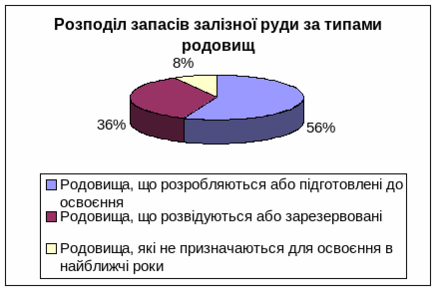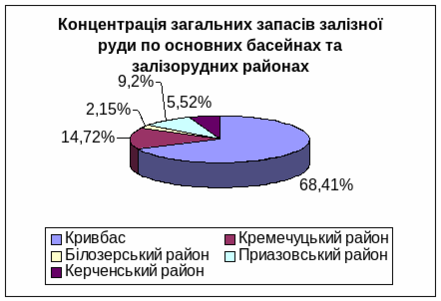 Криворізько-Кременчуцький залізорудний басейн. Окремими авторами розглядається як два окремих родовища, тому що Криворіжжя було досліджене, почало експлуатуватись ще з 1877р., коли Кременчуцька частина басейну – з 1924-1928рр. Проте за геологічними та структурними особливостями це є єдиний рудоносний масив, що вузькою (2-7км) меридіанальною смугою простягнувся більш як на 100 км. Площа басейну становить 300 км2, загальні запаси – 27,1 млрд тонн (83% загальнодержавних), а промислові запаси – 24 млрд тонн. Тут є всього 26 родовищ. Багаті руди добуваються шахтним методом, а бідні руди – здебільшого відкритим способом (10 кар’єрів та 5 збагачувальних комбінатів). Зокрема, 75% залізної руди Кривбасу видобувається відкритим способом. Крім багатих залізних руд із вмістом заліза 50-67%, тут освоюються великі запаси порівняно бідних руд і залізистих кварцитів із вмістом заліза 28-35%. Їх збагачують на Південному Криворізькому, Центральному, Північному, Інгулецькому гірничозбагачувальних комбінатах. Збагачена залізна руда перетворюється на концентрат із вмістом заліза близько 62% і надходить на агломераційні фабрики, а з них у домни. Понад 30 млн т збагаченої залізної руди поставляється на металургійні заводи європейської частини Росії, Словаччини, Угорщини, Польщі.