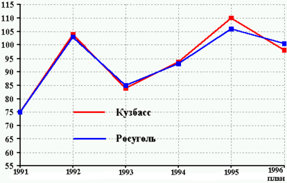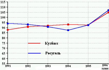 Добыча коксующихся углей по Кузбассу в 1995 году составила 39,9 млн.т., что выше показателей 1994 года на 3,5 млн.т. (+9,7%).