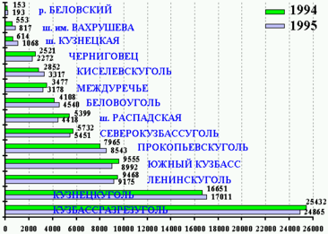 Добыча угля по объединениям и преприятиям Кузбасса в 1994, 1995 годах, тыс.тонн