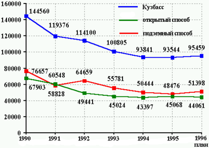 Максимальный уровень добычи в Кузбассе был достигнут в 1988 году. С 1989 года наметилась устойчивая тенденция снижения добычи угля. Первые признаки стабилизации положения наметились в 1995 году по открытому способу добычи и добыче коксующихся углей.