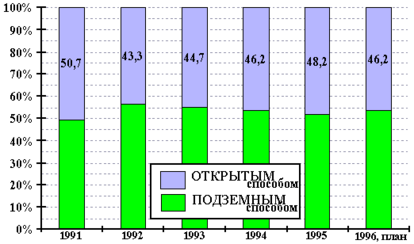 Соотношение подземного и открытого способов добычи по Кузнецкому бассейну