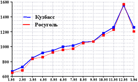Заработная плата. Уровень среднемесячной заработной платы одного работающего в системе угольной промышленности Кузбасса в январе 1996 г. составил 1264,9 тыс.руб., что на 55,4 тыс.руб. (4,6%) выше, чем в среднем по угольной промышленности России. Темп роста зароботной платы по Кузбассу за 1995 г. составил 189,7% при среднем темпе роста потребительских цен 238% (по России 234%).
