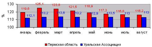 В территориальной структуре промышленного производства Урала в январе-августе Пермской области принадлежало 5 место. В сравнении с другими территориями наиболее высокое значение ИФО промышленного производства отмечалось в промышленности строительных материалов области – 139, 8 %.