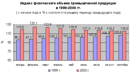 Индекс физического объема произведенной продукции по всей промышленности в январе-сентябре т.г. составил к уровню соответствующего периода прошлого года 116,0 % , по крупной и средней промышленности - 115,5 процента. Темпы производства продукции превысили показатели прошлого года во всех отраслях промышленности области. Наибольший прирост объемов продукции в сопоставимой оценке отмечен в машиностроении и металлообработке, черной металлургии, химии и нефтехимии, промышленности строительных материалов, легкой промышленности.