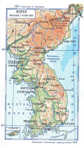 орейский полуостров замыкает северо-восточную оконечность Азиатского континента, протянувшись с севера на юг примерно на 800 км, а с запада на восток – от 132 до 360 км. На севере Республика Корея отделена от КНДР военно-демаркационной линией, проходящей примерно по 38” с.ш. Самая южная точка полуострова лежит на 33”07’ с.ш.