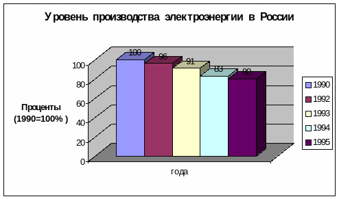 Проанализировав данные этих таблиц, можно заметить, что производство электроэнергии, достигнув пика в 1990 году, с 1991-го года начало снижаться. Это можно объяснить кризисными явлениями в российской экономике и общим спадом в промышленности (в 1995 году индекс физического объема продукции к 1990 году составил 50, т.е. производство снизилось в два раза). В большей степени это коснулось производства электроэнергии на ТЭС (значительный спад). Меньший спад производства произошел на АЭС, а на ГЭС резко замедлились темпы роста.