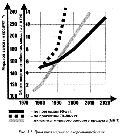 На рисунке представлены зависимости, отражающие рост мирового энергопотребления по прогнозам 70—80-х и 90-х гг., на фоне кривой мирового валового продукта.