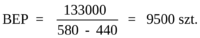 Przedsiębiorstwo produkuje jeden wyrób. Koszty jednostkowe zmienne wynoszą 440 tys. zł/szt. Przewiduje się, że przy cenie 580 tys. zł/szt. efektywny popyt wyniesie 24 tys.szt. w ciągu roku. Stałe koszty funkcjonowania przedsiębiorstwa wynoszą 1330 mln zł rocznie.