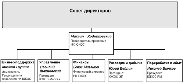 Нефтяной компанией ЮКОС управляет команда высококлассных менеджеров, которые обладают большим опытом работы в нефтяной промышленности, банковском секторе и правительстве. Они сочетают современное деловое мышление и новаторство в подходах с профессионализмом и целеустремленностью. Их знания и умения, помноженные на финансовые и технические ресурсы ЮКОСа, - залог дальнейших успехов компании.Деятельность менеджмента Компании контролирует независимый Совет директоров, в состав которого входят известные представители международного бизнеса, ученые и руководители региональных администраций, на территории которых работают предприятия НК ЮКОС. Менеджеры Компании (как действующие, так и вышедшие в отставку) занимают в Совете директоров 6 мест из 15.