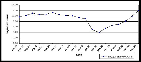уществует еще одна – чисто российская проблема, которая во всех развитых странах была бы невозможна. Это невыплаты заработной платы работникам предприятий, финансируемых из государственного бюджета. Весьма странный способ избрало правительство для сведения дефицита бюджета к минимуму – просто не платить людям заработную плату. Нередко ее задержки превышают один год. Вот динамика задолженности по заработной плате за 1997-1998 годы (см. график).[3 c197-221,222-239; 12 c10-18; 13 c124-135; 11 c133-140; 14 ]
