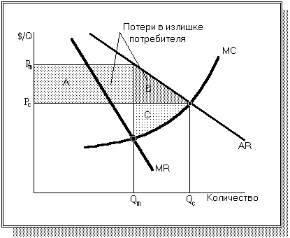 Мы можем ответить на этот вопрос, сравнивая излишек потребителей и производителей в условиях конкурентного и монополизированного рынков (мы предполагаем, что у производителей на рынке свободной конкуренции и у монополиста одинаковые кривые издержек). Рис.6 показывает кривые среднего и предельного доходов и кривую предельных издержек монополиста. Чтобы максимизировать прибыль, фирма осуществляет такой объем производства, при котором предельный доход равен предельным издержкам. Монопольная цена и объем производства обозначены как Рm и Qm. На конкурентном рынке цена должна равняться предельным издержкам и конкурентные цена РC и количество продукции QC должны находиться на пересечении кривой среднего дохода (совпадающей с кривой спроса) и кривой предельных издержек. Теперь посмотрим, как меняется излишек, если мы перемещаемся с равновесных цены РC и количества QC к монопольным цене Рm и количеству продукции Qm.При монополии цена выше и потребители покупают меньше продукции. Из-за более высокой цены те потребители, которые покупают товар, теряют часть излишка, показанную прямоугольником А. Те потребители, которые не могут купить товар по цене Рm, но купили бы его по цене РC, также теряют излишек в размере площади треугольника В. Следовательно, совокупная потеря потребительского излишка составляет А + В. Производитель, однако, получает прибыль, обозначенную прямоугольником А, продавая товар по более высокой цене, но теряет часть излишка, обозначенную треугольником С, представляющую собой дополнительную прибыль, которую производители получают от продажи (QC - Qm) по цене РC. Общая прибыль производителя, следовательно, составит А - С. Вычитая потерю потребительского излишка из прибыли производителя, мы получим чистые убытки, равные В + С. Это полные чистые убытки от монопольной власти. Даже если прибыли монополиста были обложены налогом и перераспределены в пользу потребителей продукта, эффективность не будет достигнута, потому что объем производства будет ниже, чем в условиях свободной конкуренции. Общие чистые убытки - это общественные издержки такой неэффективности.