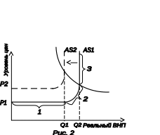 Инфляция издержек может быть изображена графически (рис. 2). Смещение кривой совокупного предложения влево (AS1 AS2) в результате действия указанных причин отражает увеличение издержек на единицу продукции, возрастают цены, сокращается реальный объем производства или реальный ЧНП.