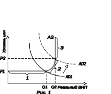 величение денежной массы по указанным выше причинам в течение короткого промежутка времени сдвигает кривую совокупного спроса вправо (AD1 AD2), и если экономика находится на промежуточном (2) или классическом (3) отрезках кривой совокупного предложения, то это ведет к росту цен, что представляет инфляцию спроса.