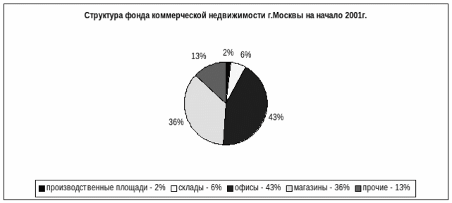 Правительство Москвы утвердило баланс нежилых зданий и помещений г. Москвы по состоянию на 01.01.2000г. Общая площадь нежилых помещений, находящихся в собственности г. Москвы составляет 46,7 млн. кв. метров, из них лишь около 8,5 млн. кв. метров (порядка 18,2%) город официально сдает в аренду. Остальные нежилые помещения, расположенные в г. Москве, являются федеральной собственностью, а также находятся в собственности юридических и физических лиц. Часть нежилых помещений г. Москвы используется для коммерческих целей. Структура фонда коммерческой недвижимости г. Москвы по состоянию на начало 2001 года представлена ниже на диаграмме № 2: