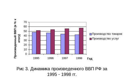 Так как увеличивается производство товаров, следовательно, имеет место рост промышленного производства. Его можно объяснить тем, что российская промышленность вступила в 2000 год на фоне заметного увеличения темпов выпуска продукции в 1999 году, обусловленного эффектом девальвации российского рубля (расширение поставок на экспорт продукции ряда отраслей, развитие процесса импортозамещения), улучшением финансового положения промышленных предприятий и рядом других факторов, в том числе расширением внутреннего спроса – инвестиционного и потребительского, и наращиванием объемов экспорта. Однако, за последние 6 лет наблюдался другой процесс – уменьшение доли отраслей, производящих товары и увеличение доли отраслей, производящих различные услуги (см. рис. 3 и таблицу 2).