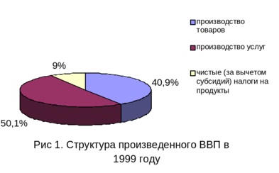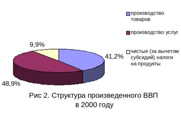 Структура ВВП в 2000 году характеризовалась опережающим ростом доли отраслей, производящих товары. В структуре ВВП, рассчитанному по производственному методу, доля производства товаров составила 41,2% против 40,9% за 1999 год, а доля производства услуг, соответственно, - 48,9% против 50,1%. Доля чистых (за вычетом субсидий) налогов на продукты составила 9,9% против 9,0% в 1999 году (см. рис. 1,2 и табл. 1).