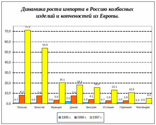 Например, импорт в Россию колбасных изделий и копченостей из Европы в период с 1995 года по 1997 год значительно увеличился (см. рис.1)