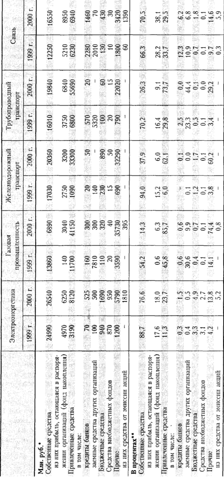 В газовой промышленности в 1999 г. доля прибыли в источниках финансирования капиталовложений составила всего лишь 0,6%, что существенно меньше, чем в электроэнергетике, на железнодорожном и трубопроводном транспорте (15-17%). Зато доля "заемных средств других организаций" на два порядка больше (30,6%), чем в электроэнергетике (0,4%) и на железнодорожном транспорте (0,1%). В целом в 1999 г. электроэнергетика, железнодорожный транспорт, газовая промышленность и трубопроводный транспорт опирались в первую очередь на нерыночные формы привлечения средств для капиталовложений в основные фонды.