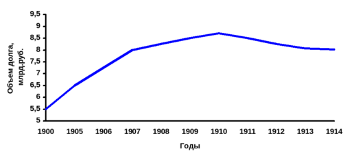 Кредитная история России началась в 1769 г., когда Екатерина II сделала первый заем в Голландии. За последующие два с половиной столетия Российская империя заняла на рынке примерно 15 млрд. руб. Большая часть этих средств накануне революции была погашена. К этому моменту старейшими займами в составе русского государственного долга оставались 6%-ные займы 1817-18 гг. Их нарицательный капитал составлял 93 млн. руб., а непогашенная часть к 1 января 1913г. равнялась 38 млн. руб. На графике отражена динамика государственного долга Российской империи в начале XX в.: сумма задолженности возросла в период русско-японской войны и революции, а затем стабилизировалась.