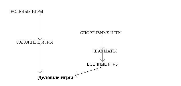 Исходным моментом развития всех игр, которые можно рассматривать как модель сотрудничества и конфликта, является ролевая игра. Дальнейшее их развитие, возникновение спортивных, салонных игр связано с уменьшением драматического компонента, отражающего социальное взаимодействие. Начиная с военных игр значение этого компонента снова начинает возрастать. С дальнейшим усилением драматического компонента связано возникновение деловых игр, которые произошли из военных, (рис. 1)