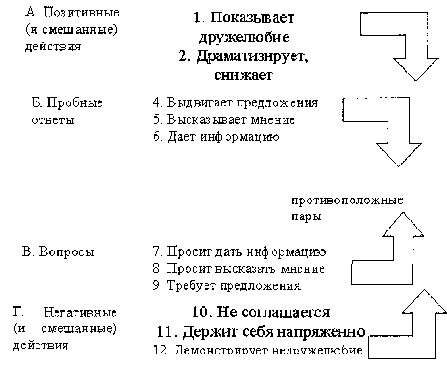 функция решения задачи и функция оказания поддержки. Выполнение функций решения задачи - это достижение намеченных целей. Поведение, определяемое задачей, включает выдвижение и принятие предложений, мнений, информации. Функции оказания поддержки связаны с социальным и эмоциональным климатом коллектива. Они обеспечивают сплоченность, которая облегчает достижение групповых целей. Эти функции реализуются в таких формах поведения, как дружеские либо недружеские действия, согласие или несогласие, драматизация или демонстрация напряжения.