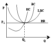 С одной стороны , условие Р = АС показывает , что фирма достигает равновесия при равенстве цены и минимальных средних издержек , то есть в производстве используются наиболее эффективные технологии с наименьшим расходованием ресурсов . Кроме того , условие АС = LAC предусматривает , что фирма имеет оптимальные размеры , когда краткосрочные средние издержки равны минимальным долгосрочным средним издержкам .