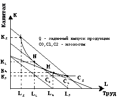 Фирма не может избрать изокосту С0 , т.к. нет такого сочетания факторов , которое обеспечило бы выпуск продукции Q при их стоимости , равной С0 . Заданный объем производства может быть обеспечен при расходах , равных С2 , когда затраты труда и капитала соответственно равны L2 и К2 или L3 и К3 . Но в этом случае издержки не будут минимальными , что не отвечает поставленной цели . Значительно эффективнее будет решение в точке N , т.к. при этом набор факторов производства обеспечит минимизацию издержек производства . Сказанное выше верно при условии , что цены на факторы производства неизменны . На практике так не бывает . Предположим , что цена капитала увеличится . Тогда угол наклона изокосты , равный – (w/r) , уменьшится , а кривая С1 станет более пологой . Минимизация издержек в данном случае будет иметь место в точке М со значениями L4 и К4 . В связи с увеличением цены на капитал фирма заменяет капитал трудом .