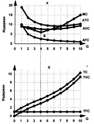 Сумма постоянных и переменных издержек при каждом данном объёме производства образует общие издержки ТС (total costs-общая стоимость). Из графика видно, что для получения кривой общих издержек сумму постоянных издержек TFC необходимо прибавить к сумме переменных издержек TVC (рис. 1).