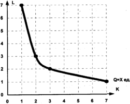 редположим, что фирма использует два переменных фактора - труд и капитал. Цена единицы труда РL составляет 2 денежные единицы, цена единицы капитала РK - 3 денежные единицы. Заданный объём выпуска достигается путём применения таких комбинаций производственных факторов, как 7L и 1K, ЗL и 2K, 2L и ЗK, 1L и 7K. На основании приведенных данных построим изокванту выпуска Х единиц продукции (рис. 5).