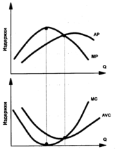 Из рис. 3 видно, что между динамикой изменения предельного продукта (предельной производительности) и предельных издержек (равно как и среднего продукта и средних переменных издержек) существует обратная связь. До тех пор пока предельный (средний) продукт будет расти, предельные (средние переменные) издержки будут снижаться и наоборот. В точках максимального значения предельного и среднего продуктов величина предельных МС и средних переменных AVC издержек будет минимальной.