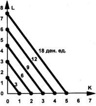 алее будем рассуждать так: если предприниматель имеет только 3 денежные единицы, то он может приобрести только 1 единицу капитала. Обозначим соответствующие точки на осях абсцисс и ординат и соединим их прямой. Получится изокоста (изокоста значит "равные издержки") 3 денежных единиц. Изокоста - это прямая, каждая точка которой показывает различные комбинации вовлекаемых в производство двух переменных факторов при одинаковых издержках на их приобретение. Аналогичным образом построим изокосты 6, 9, 12 и 18 денежных единиц. Получится карта изокост (рис.6)
