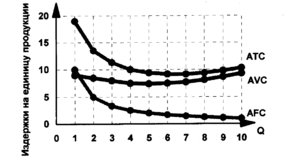 Средние общие издержки АТС (average total costs-переменная общая стоимость) - рассчитываются по формуле АТС = ТС/Q. На рис. 2 кривая средних общих издержек получена путём сложения по вертикали величин средних постоянных AFC и средних переменных издержек AVC. Кривые АТС и AVC имеют U-образную конфигурацию. Обе кривые в силу закона убывающей отдачи загибаются вверх при достаточно высоких объёмах производства. При увеличении числа занятых работников, когда постоянные факторы неизменны, производительность труда начинает падать, вызывая соответственно рост средних издержек.