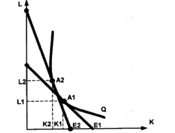 Чтобы сохранить прежний объём выпуска (остаться на прежней изокванте Q), фирме необходимо осуществить технологическую замену капитала трудом. Угол наклона изокосты увеличится, и она примет положение Е2. Теперь фирма будет минимизировать свои издержки в точке А2, применяя К2 единиц капитала и L2 единиц труда.