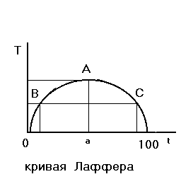 дним из действенных факторов увеличения совокупного предложения сторонники данной концепции считают снижение налогов. При этом они опираются на кривую Лаффера. А.Лаффер считал, что по мере роста ставки налога ( t ) от 0 до 100 % налоговые поступления ( Т ) сначала увеличиваются и достигают максимума в точке А при t = а, а затем падают, несмотря на рост налоговой ставки. Падение налоговых поступлений, по предположению Лаффера, связано с тем, что более высокие ставки сдерживают экономическую активность (падают инвестиции, потребление, сбережения и пр.), а следовательно сокращают налоговую базу, поэтому даже при росте налоговой ставки поступления от налогов падают.