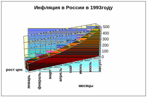 0 развитии инфляционных процессов в России невозможно говорить без обращения к цифрам, показывающим темпы этой инфляции. А эти цифры говорят о том, что в 1993 г. страна подошла очень близко к грани гиперинфляции, хотя в отдельные месяцы растущее движение цен и удавалось несколько замедлить. При этом надо помнить, что здесь мы имеем дело с ростом цен, происходящим по модели сложных процентов, в силу чего общее повышение цен оказывается куда большим, чем просто сумма повышений цен за указанные выше месяцы. Итого вый рост цен за 8 месяцев 1993 г. показан на диаграмме 1.