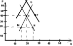 E – точка рыночного равновесия, характеризующая цену рыночного равновесия и объем рыночного равновесия.