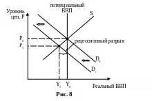 еперь, допустим, что монетарная политика действует наоборот, то есть она сдвигает кривую совокупного спроса влево-вниз (рис. 8) и создаёт рецессионный разрыв. Если фискальные органы захотят восстановить реальный ВВП до его естественного уровня, они должны сдвинуть кривую совокупного спроса обратно до её начального положения, D0. Чтобы сделать это, они также должны увеличить расходы, либо понизить налоги, увеличивая бюджетный дефицит. Таким образом, сдерживающая монетарная политика изменяет соответствующую фискальную политику от сбалансированного бюджета к бюджетному дефициту.