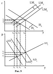 Уменьшение госрасходов и увеличение налогов приводит к сдвигу кривой IS влево в положение IS1, и, следовательно, новое равновесие устанавливается при r1 и y1. В то же время, график совокупного спроса сдвинется из положения AD0 в положение AD1, при уровне цен P0 образуется избыток на рынке благ в размере y0-y1. Как уже было сказано выше, происходит уменьшение денежной массы в обращении - это приводит к сдвигу кривой LM влево в положение LM1, что незамедлительно скажется на сдвиге кривой совокупного спроса в AD2, а это увеличивает избыток до y0-y3. Для стимулирования спроса и сокращения предложения необходимо понизить цену Р до P2. Это увеличение отразится на графике LM, как сдвиг её (кривой) вправо до LM2, ставка процента сократится с r2 до r3, а совокупный спрос увеличится с y2 до y3.