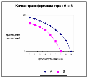 ривая трансформации может иллюстрировать и различия, существующие в области производственных возможностей разных стран. Так, на рисунке 2 изображены кривые трансформации стран А и В.