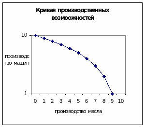 Производственные возможности общества – это максимально возможный объем производства благ при полном и эффективном использовании имеющихся ресурсов. Эффективность производства – это отношение полученного результата к ресурсам, затратам. Возрастающие потребности общества ориентируют на постоянное увеличение результата. Но, поскольку ресурсы ограничены, то ограничены и производственные возможности. Увеличение объемов производства одного продукта может быть достигнуто лишь при частичном или полном отказе от производства другого. Ограниченность ресурсов определяет их альтернативное использование. Поскольку ресурсы редки, экономика полной занятости, полного объема производства не может обеспечить неограниченный выпуск товаров и услуг. Более того, следует принимать решения, какие товары и услуги следует производить, а от каких отказаться. Ограниченность ресурсов означает ограниченность и выпуска. Поскольку ресурсы ограничены и применяются целиком, всякое увеличение производства в одном, к примеру производство машин, потребует переключение части ресурсов с производства другого, к примеру масла. И противоположный вывод- если необходимо увеличить производство масла, то необходимые ресурсы должны быть получены лишь за счет сокращения производства машин. Общество не может преследовать две взаимоисключающие цели при полной занятости ресурсов.