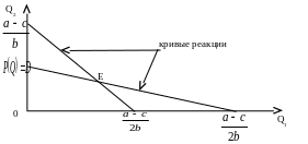 Если первая фирма знает выпуск второй фирмы, то, воспользовавшись кривой реакции, она считает свой выпуск. В свою очередь вторая фирма считает свой выпуск с помощью своей кривой реакции. Первая фирма пересчитывает свой план и т.д. Чем закончится данный процесс? Выпуск установится в точке Е (см. рисунок) – пересечении кривых реакции. Точка Е – точка совместного равновесия. Таким образом мы получили кооперативное равновесие Курно.